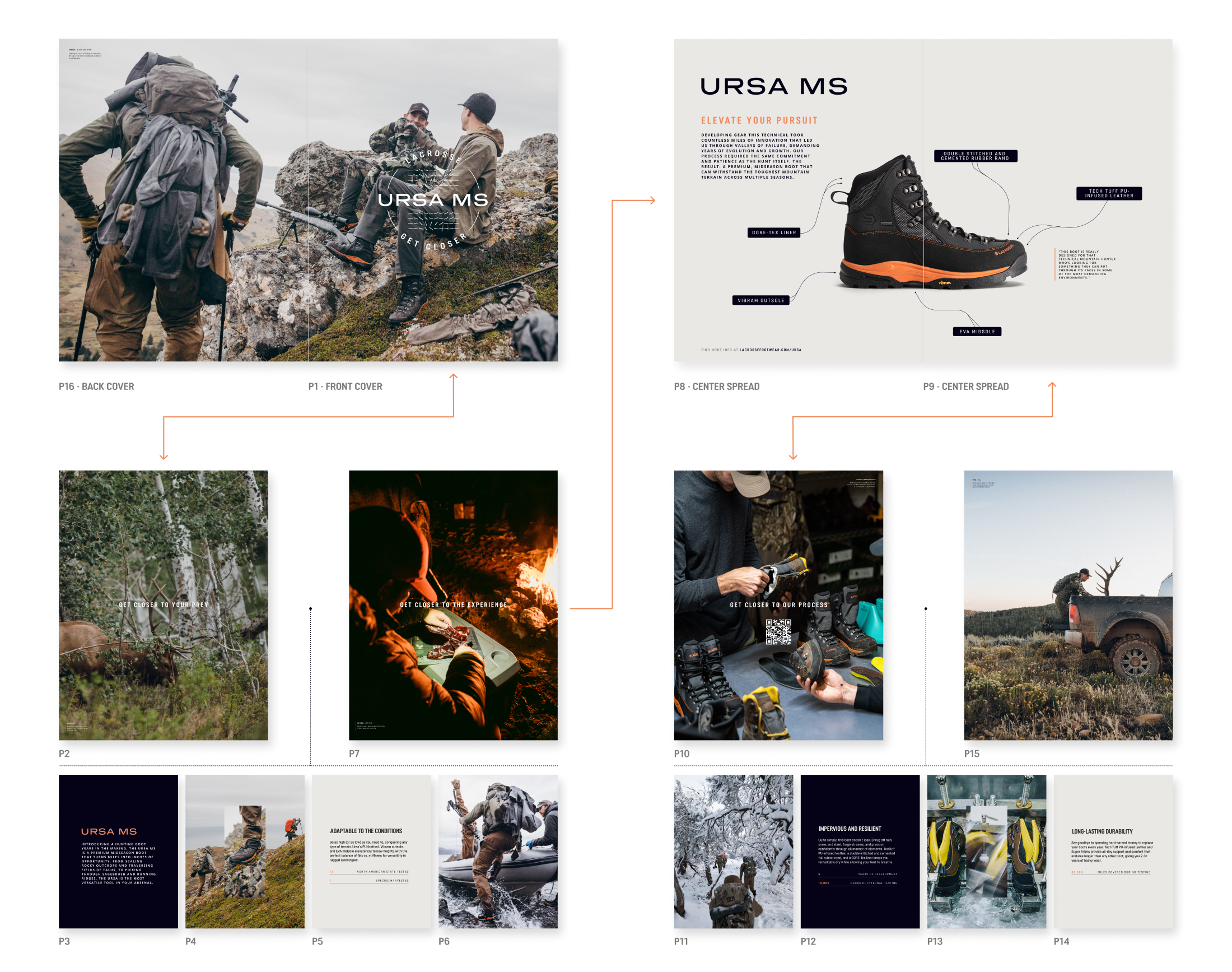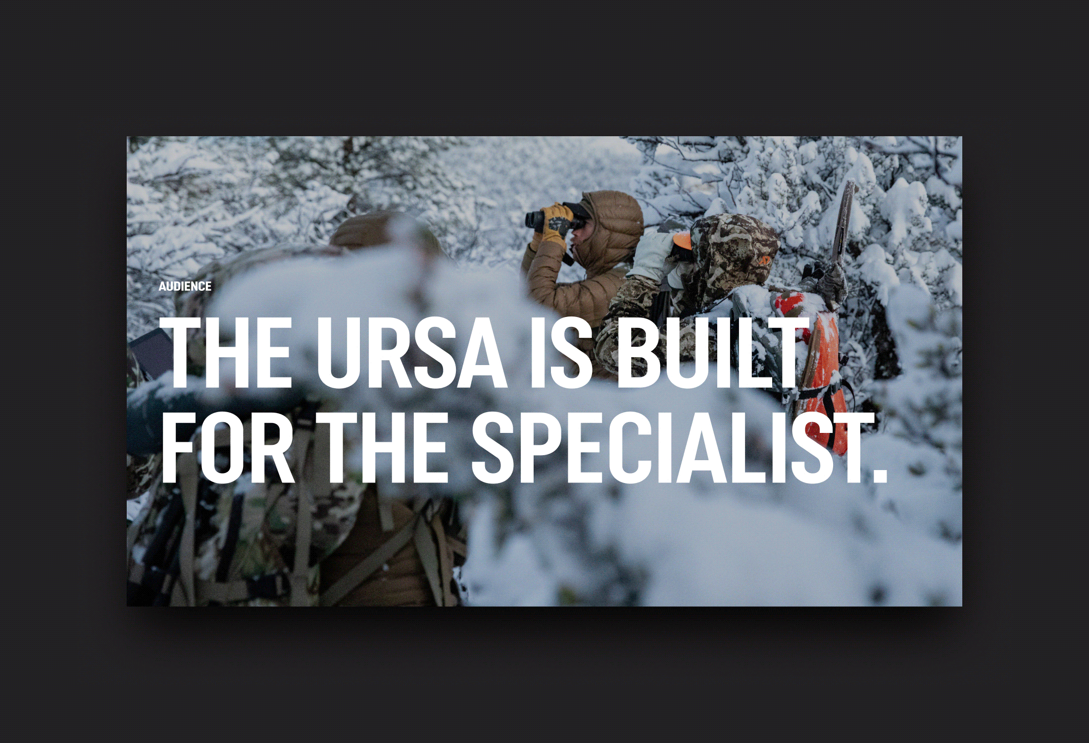 To ensure a cohesive and impactful brand presence across all channels, we created a comprehensive creative system that supported a variety of marketing touchpoints, including digital platforms, in-person events, and physical marketing materials. Drawing inspiration from the Ursa MS's technical details, we explored visual elements that were inspired by the dynamic movements of wind and the dramatic elevation changes of the environments in which the Ursa MS thrives. We seamlessly integrated these elements into our campaign to complement the inspiring hunt and product development imagery. The result was a compelling and memorable brand identity for the Ursa MS that resonated with our target audience.