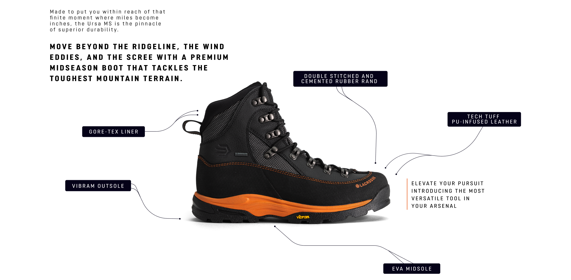 In 2023, LaCrosse Footwear unveiled their highly anticipated Ursa MS - a premium and technically advanced mountain boot designed for the most elite hunter. Our mission was to establish a distinctive position in the market by emphasizing the exceptional durability and quality of this product. To achieve this, we implemented a creative and strategic approach that showcased the Ursa's unique technical features and immersed users in the challenging environments where it excels. We aimed to evoke the visceral emotions of the hunting experience by inviting the hunter to "Get Closer" to their prey, the experience, and our process throughout the storytelling of the campaign. In this portfolio case study, we invite you to explore our journey of crafting a successful marketing campaign for the Ursa MS - from concept to execution.